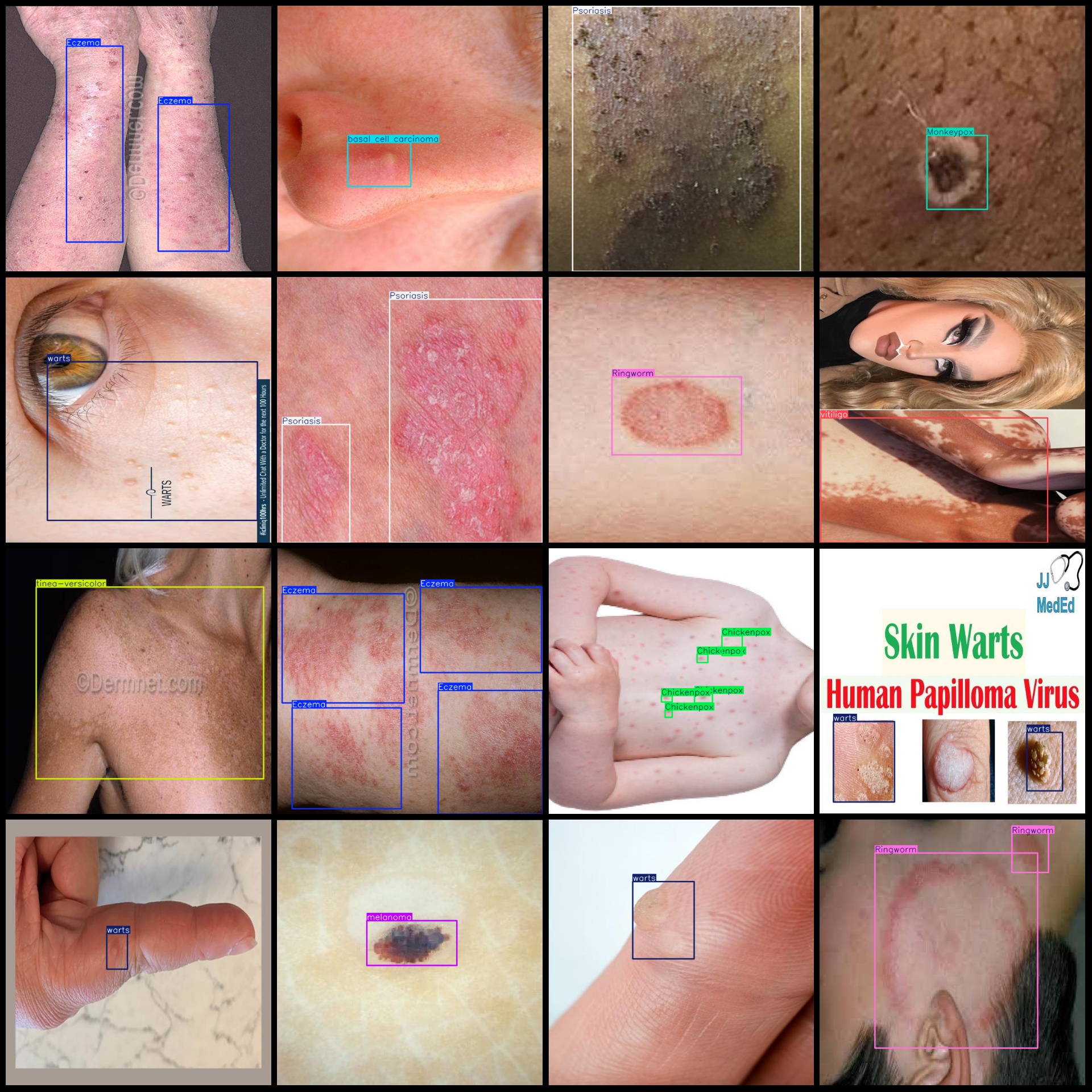 标注类别名称(注意yolo格式类别顺序不和这个对应,而以labels文件夹classes.txt为准):["Acne","Chickenpox","Eczema","Monkeypox","Pimple","Psoriasis","Ringworm","basal cell carcinoma","melanoma","tinea-versicolor","vitiligo","warts"]