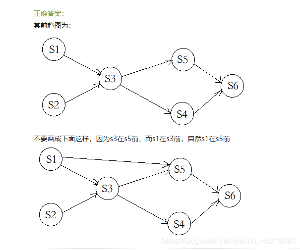 S2 → S3 → S5 → S6分析: S1与S2可以并发执行,因为它们互不依赖;但是S3必须在a(S1)、b(S2)被赋值后才能执行,S4必须在c(S3)之后才能执行,S5必须在c(S3)被赋值后才能执行,S6必须在e(S4)、f(S5)被赋值后才能执行。 画图: 具有如图所示的前趋关系: