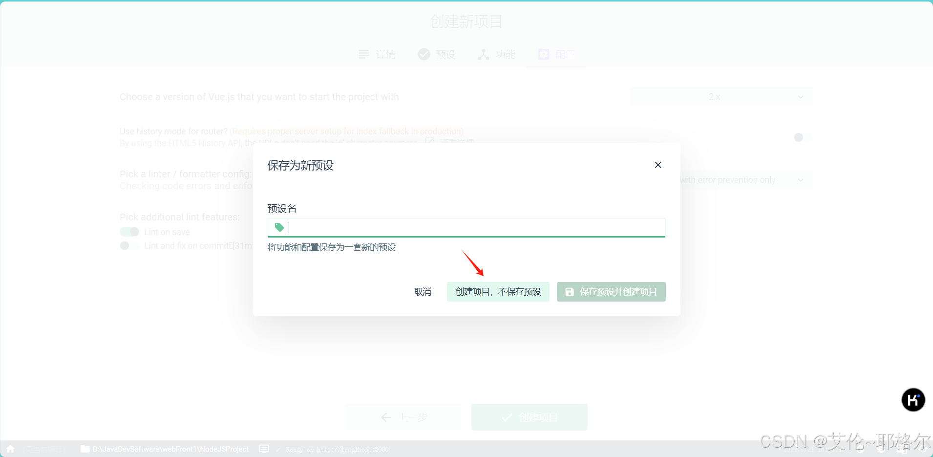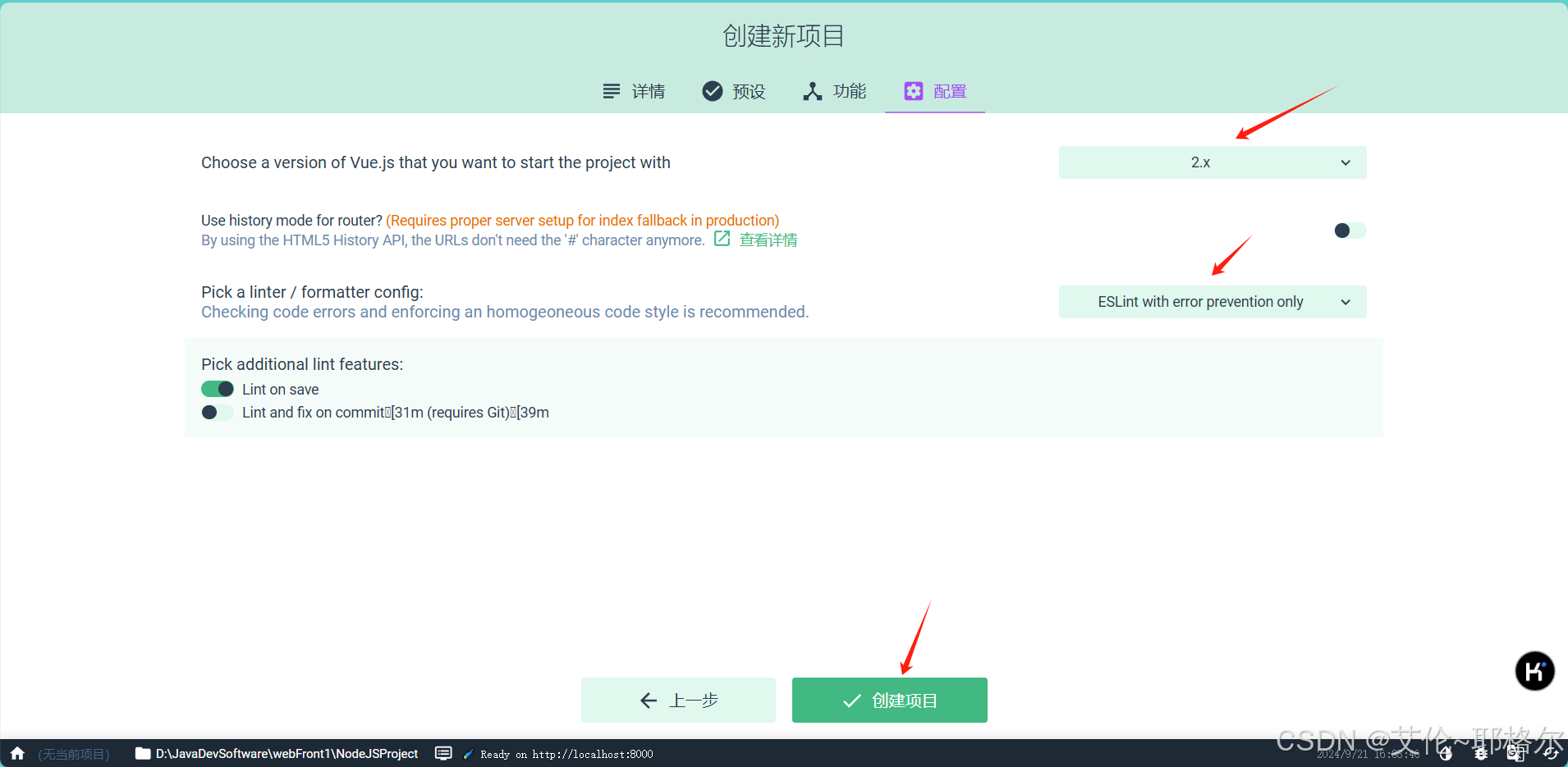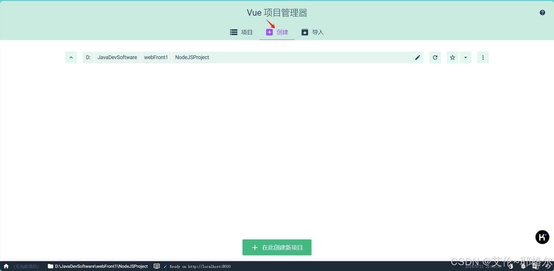 4.回车后会进入vue图形化界面管理器,如图所示,点击创建,就会进入NodeJSProject这个文件夹,在这个文件夹进行vue项目的创建,当然点击上面的路径也可以随时切换你要创建项目的路径