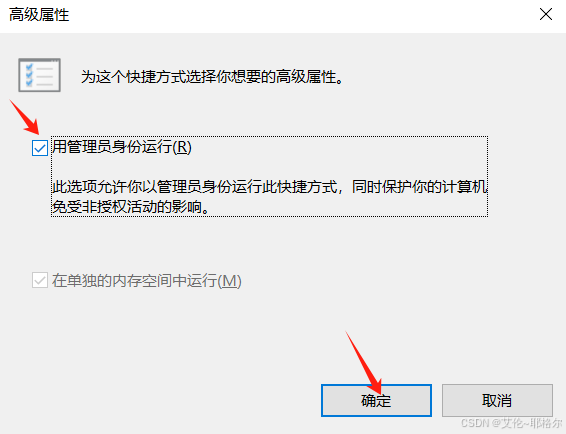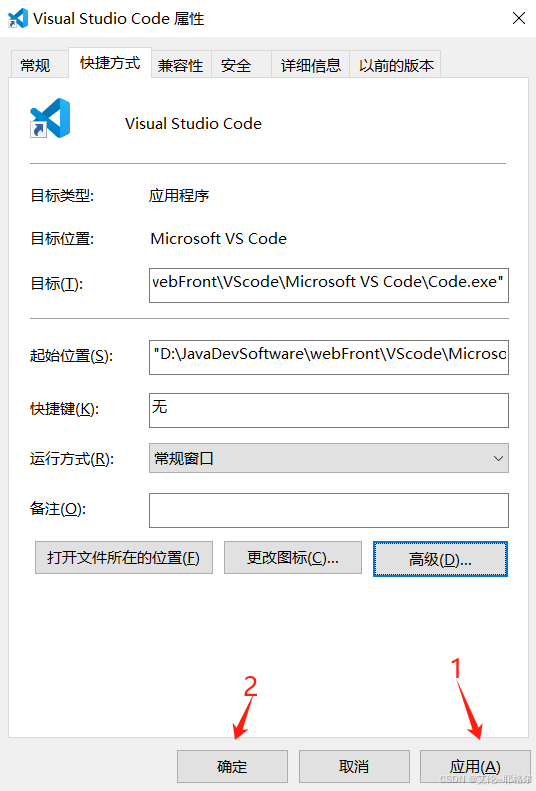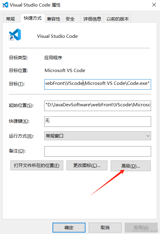3.(此步骤可省略,若是项目运行失败,可按照此步骤进行设置)启动前先关闭VS Code,进行如下设置,在桌面找到VS Code快捷方式图标,右键单机,点击属性,点击高级,勾选用管理员身份运行,点击确定