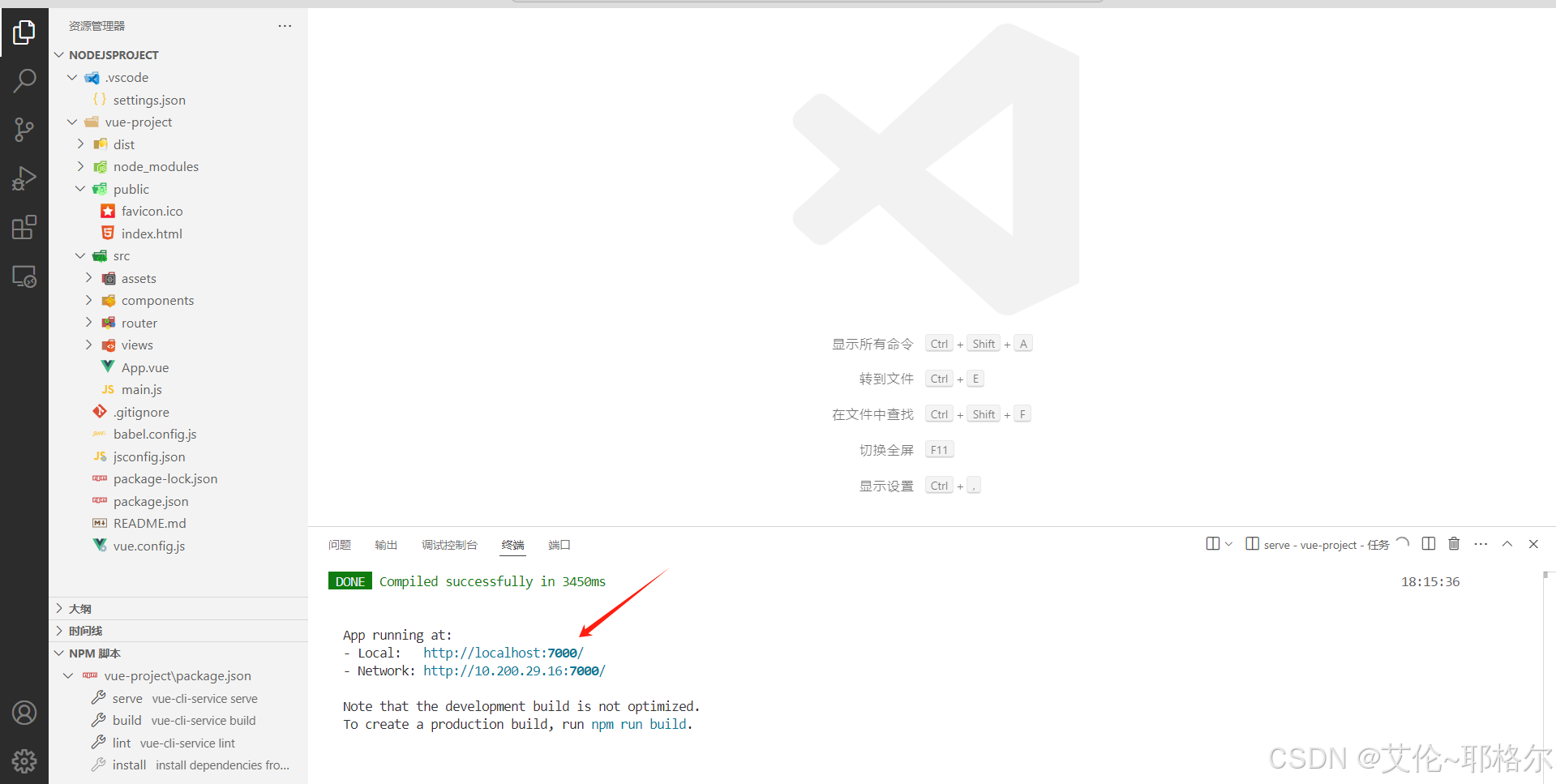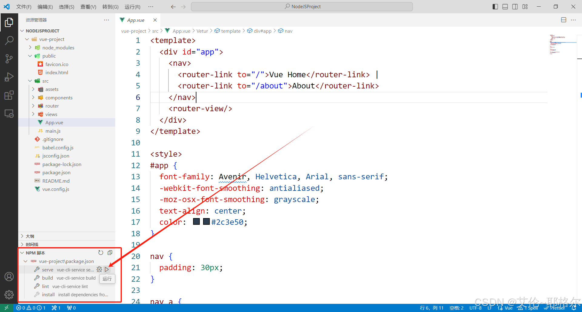 4.开始运行Vue项目,找到NPM脚本,点击server的运行,即小三角形符号