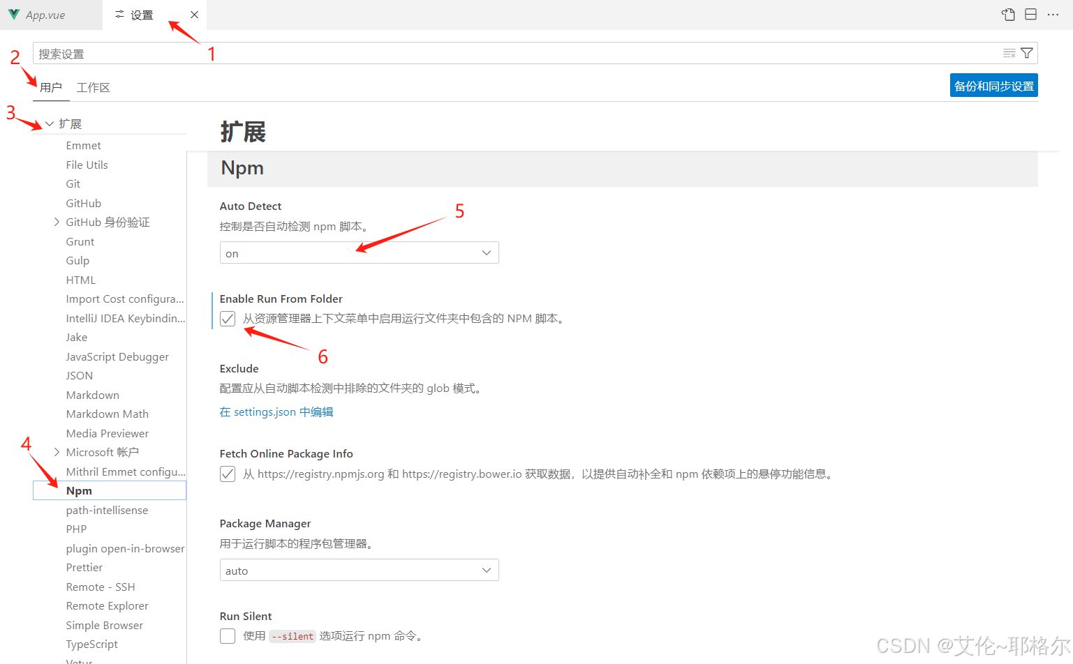 2.若不存在NPM脚本,进行以下设置,找到设置->用户->扩展->Npm,配置5 6 操作,然后重启 VS Code