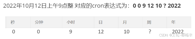 秒 分 时 日 月 周 年举例:(周 和 日 不能同时出现,若一定要同时出现,则其中一个必须为“ ?”,因为会产生冲突)