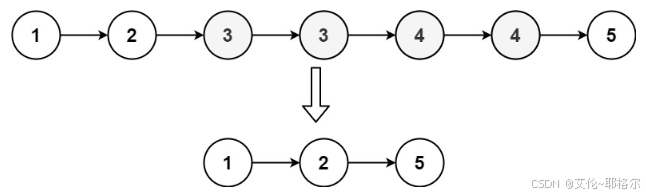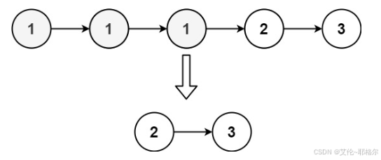 输出:[2,3]由于链表已排序,重复元素必然相邻。 我们可以使用一个预先指针 prev 指向 potentially 要保留的节点的前一个节点,curr 指针遍历链表。
