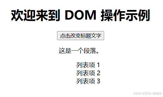 获取所有的列表项,并为每个列表项添加点击事件处理程序。当列表项被点击时,会弹出一个警告框显示点击的是哪个列表项。这个例子展示了如何使用 JavaScript 操作 HTML DOM(文档对象模型)中的元素,包括选择元素、修改元素内容以及响应用户的交互动作。
