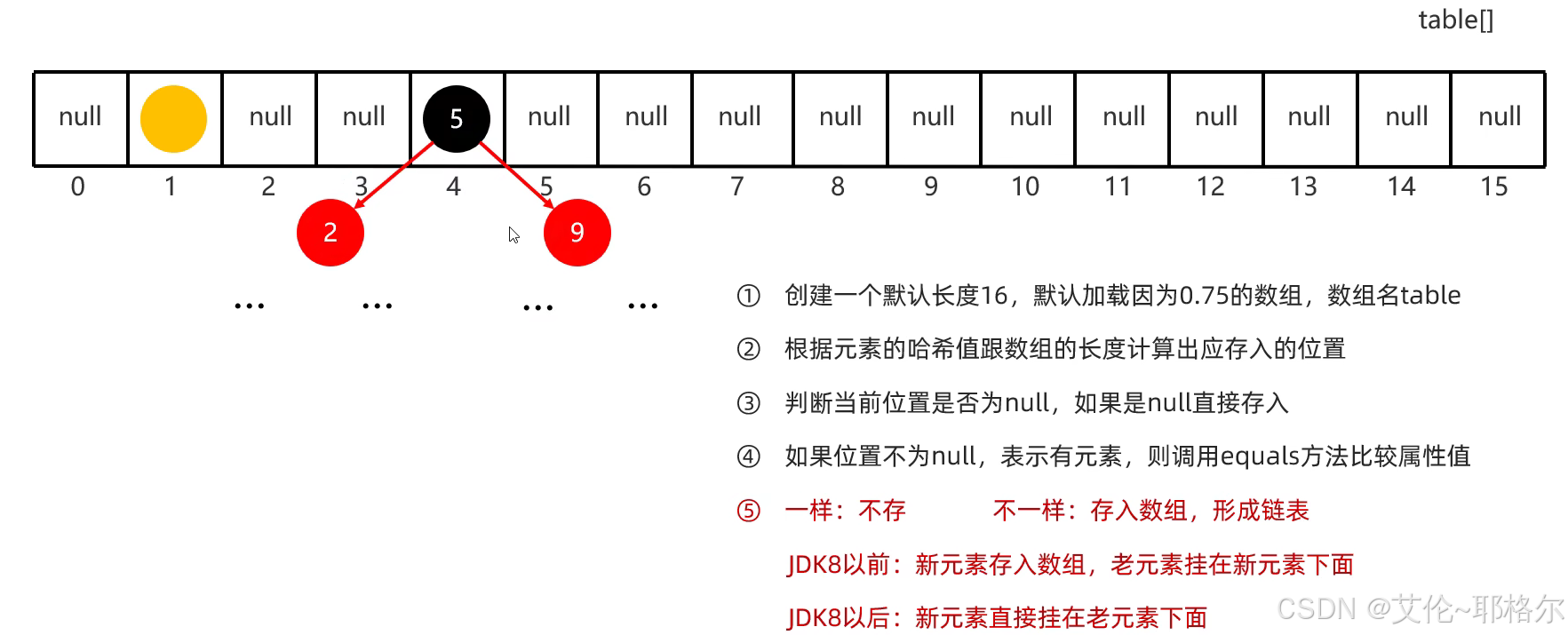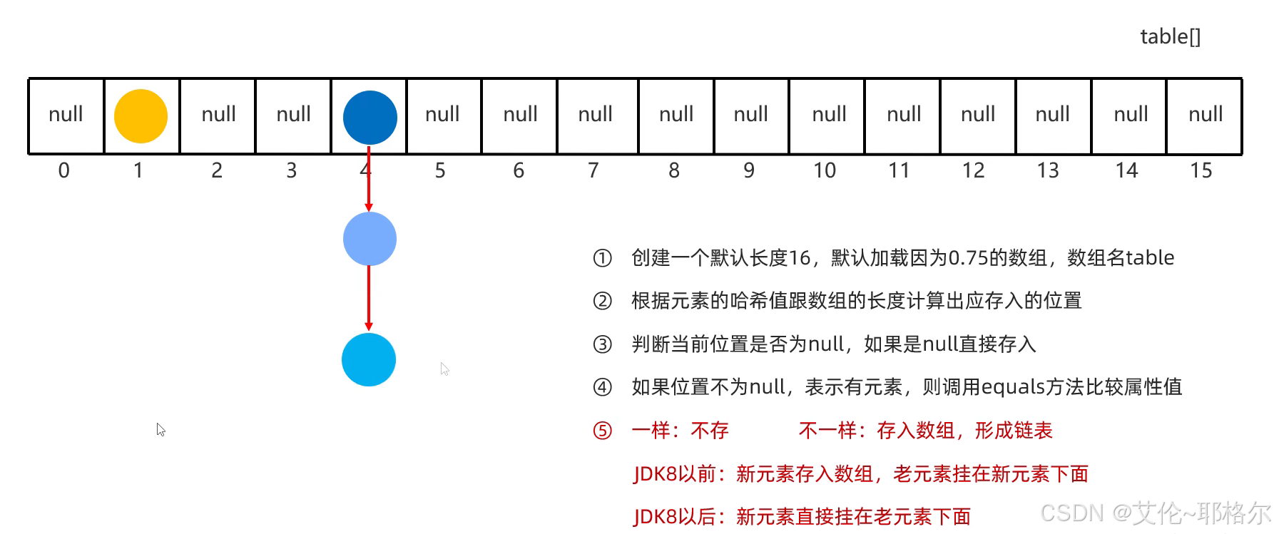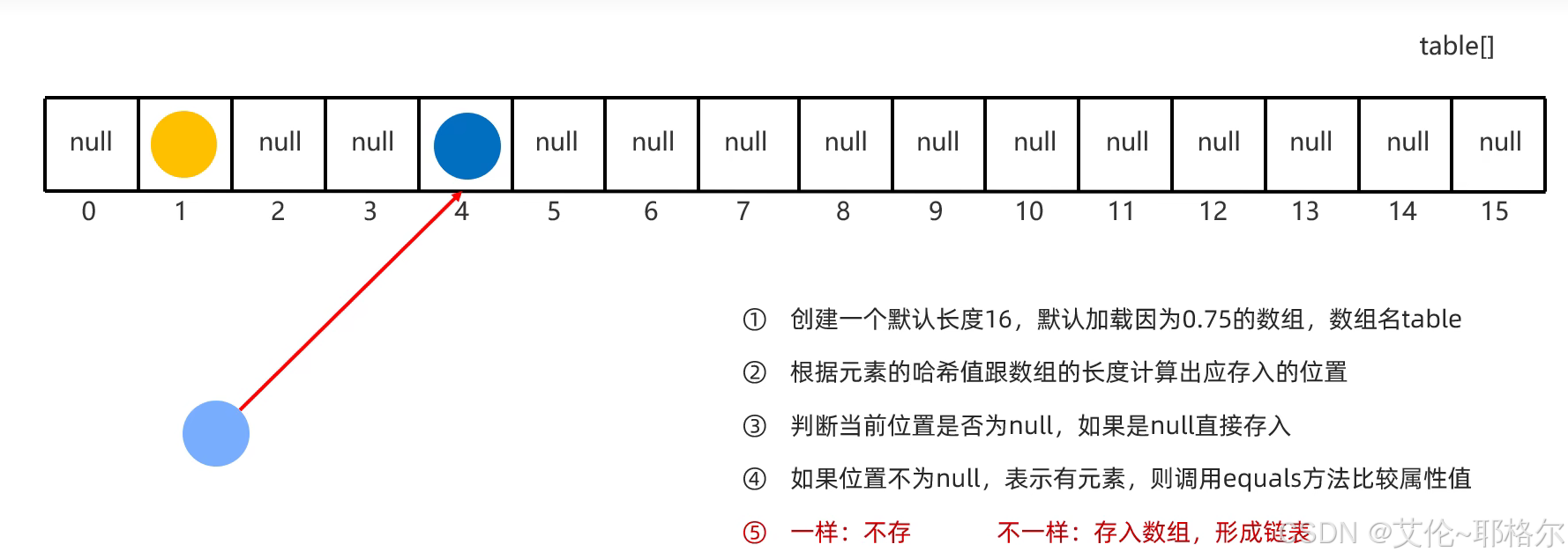 c.若又计算到索引4且不为null表示有元素,会有两种情况,首先调用equals方法比较内部属性值是否一致,若一样则不存,反之存入数组,形成链表(若再不为null则继续调用equals比较其内部属性值,一样不存不一样则挂入链表)。