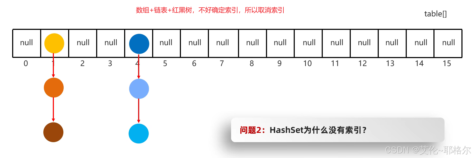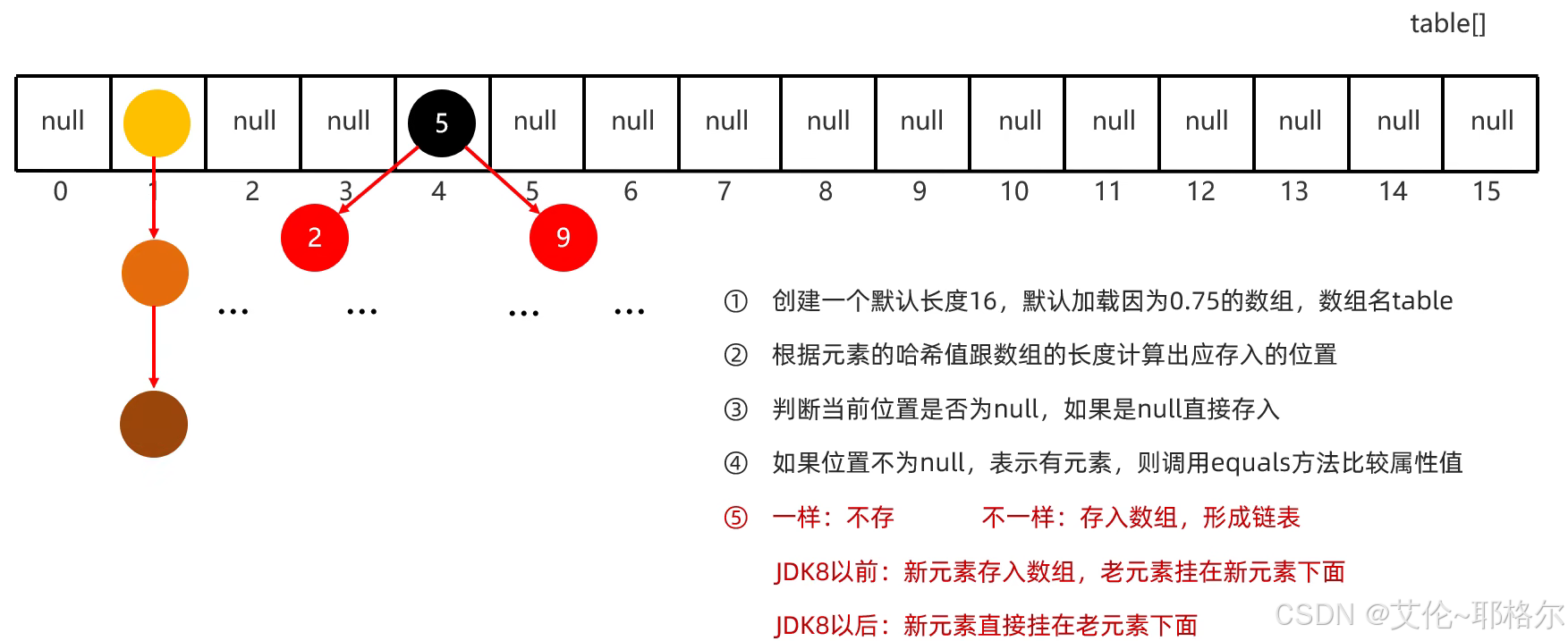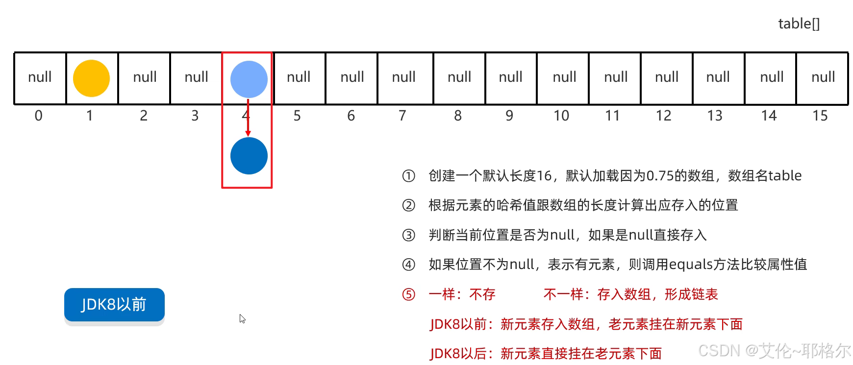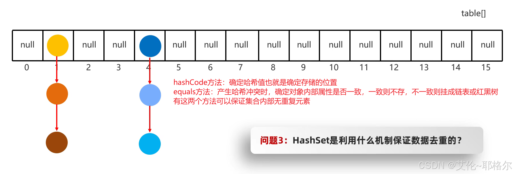 c.若又计算到索引4且不为null表示有元素,会有两种情况,首先调用equals方法比较内部属性值是否一致,若一样则不存,反之存入数组,形成链表(若再不为null则继续调用equals比较其内部属性值,一样不存不一样则挂入链表)。