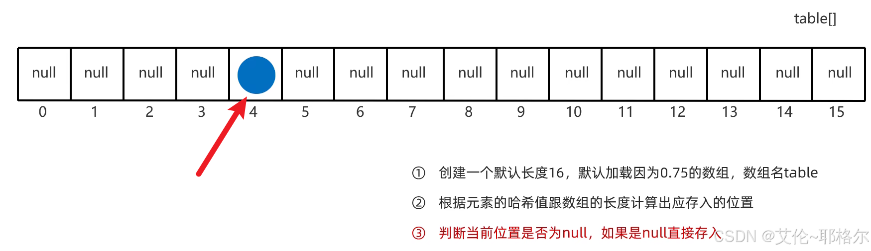 b.添加第一个元素,计算得index为4且索引4位置为null,则存储到索引4位置。