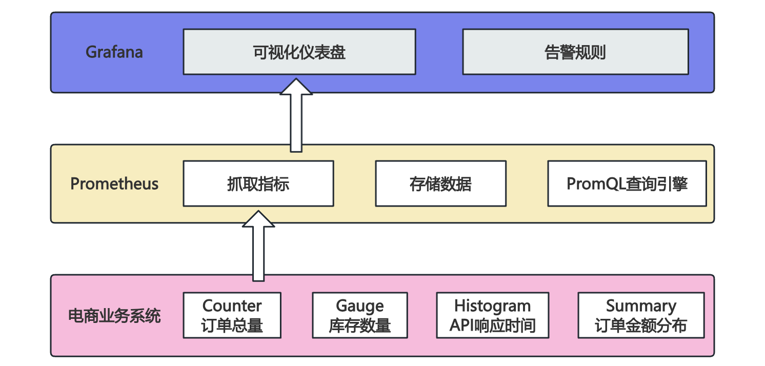 这时候,Prometheus的四大指标类型就派上用场了!让我们通过一个真实的电商系统来搞懂它们。