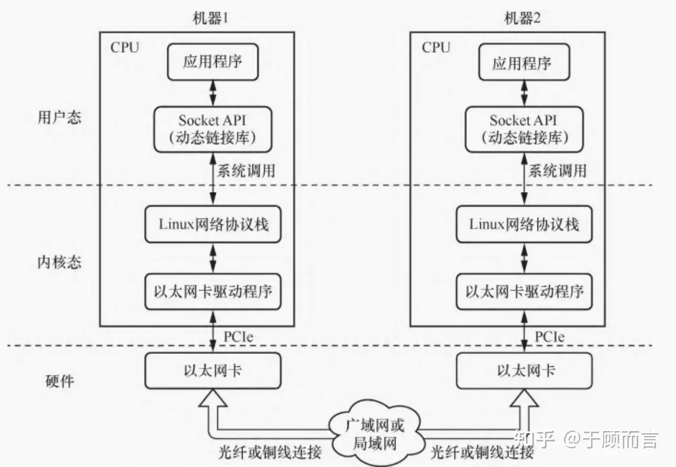 Linux 网络协议栈和以太网卡驱动程序运行在内核态。Linux 网络协议栈是连接应用和驱动程序的中间层,负责按照应用程序的要求建立网络连接和封装(发送时)、解析(接收时)数据包。以太网卡驱动程序是和特定的网卡绑定的,负责操控硬件,将协议栈封装好的数据包发送到外部网络中,或将网卡从外部网络接收到的数据包转发给协议栈。