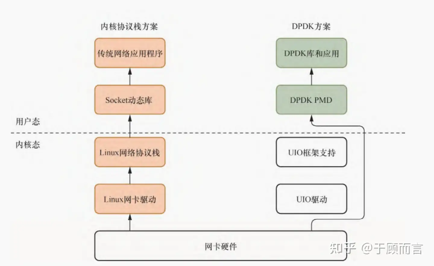 在传统内核协议栈中,应用程序与网络协议栈的交互导致频繁的用户态与内核态切换,严重影响了数据收发的整体时延。而 DPDK 通过将大部分操作置于用户态执行,显著减少了内核态参与,实现了更高的网络性能。
