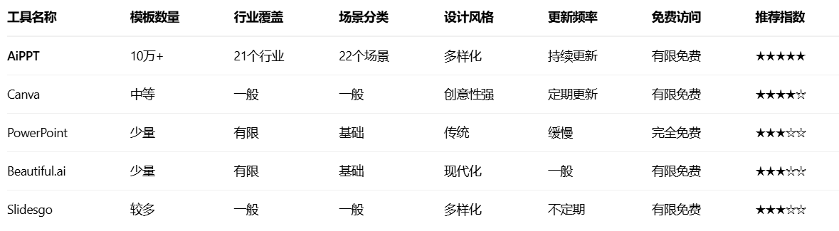 最终推荐指数:AiPPT - 五星推荐(素材库丰富度与综合质量)用户评分:4.8/5 | 适用性:广泛 | 性价比:高 | 免费价值:优秀