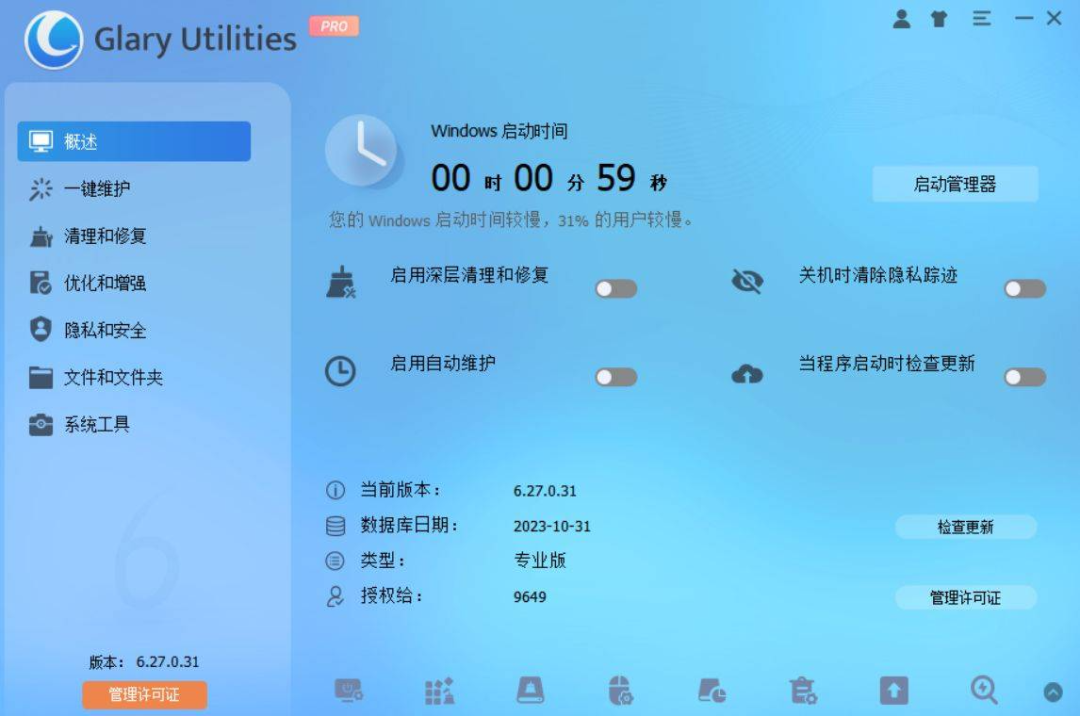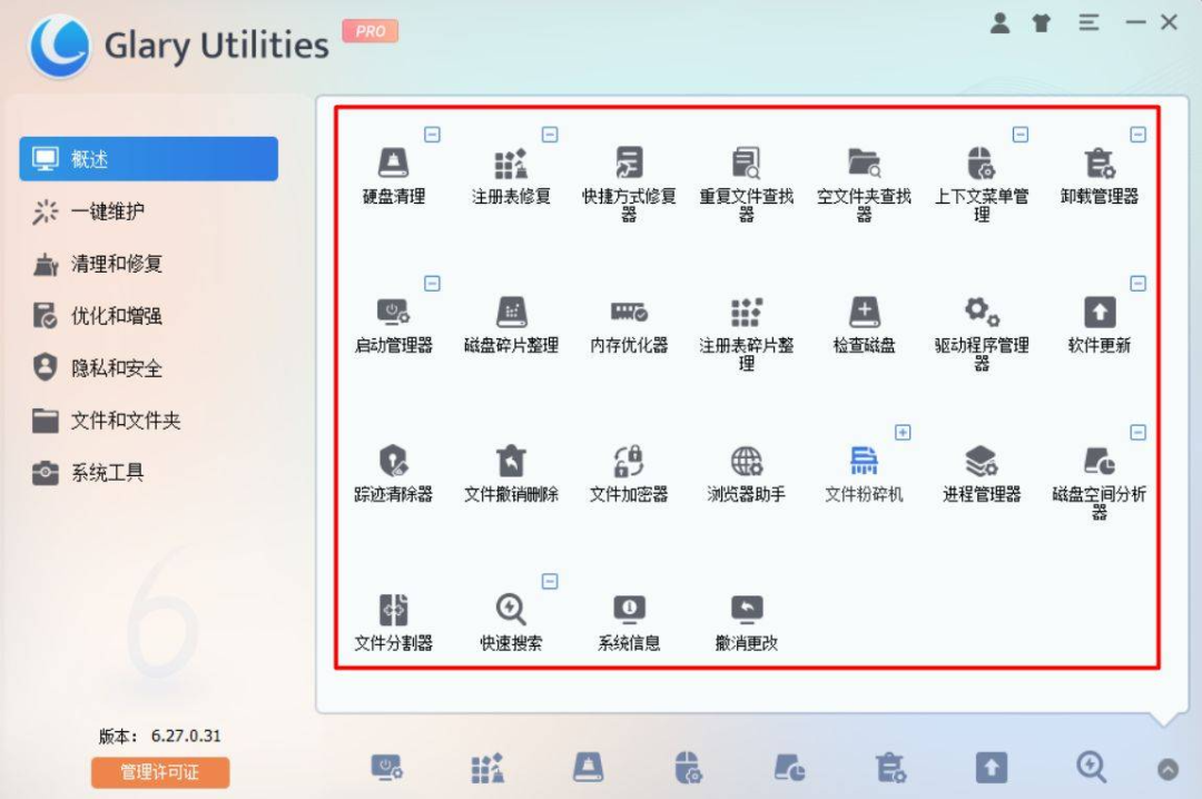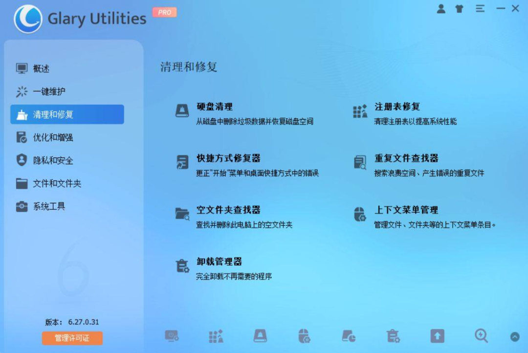 Glary Utilities 是一款功能全面、操作简单的系统清理和优化工具。它整合了清理、加速、修复、保护等多种功能,基本上能满足大多数人日常养护电脑的需求。