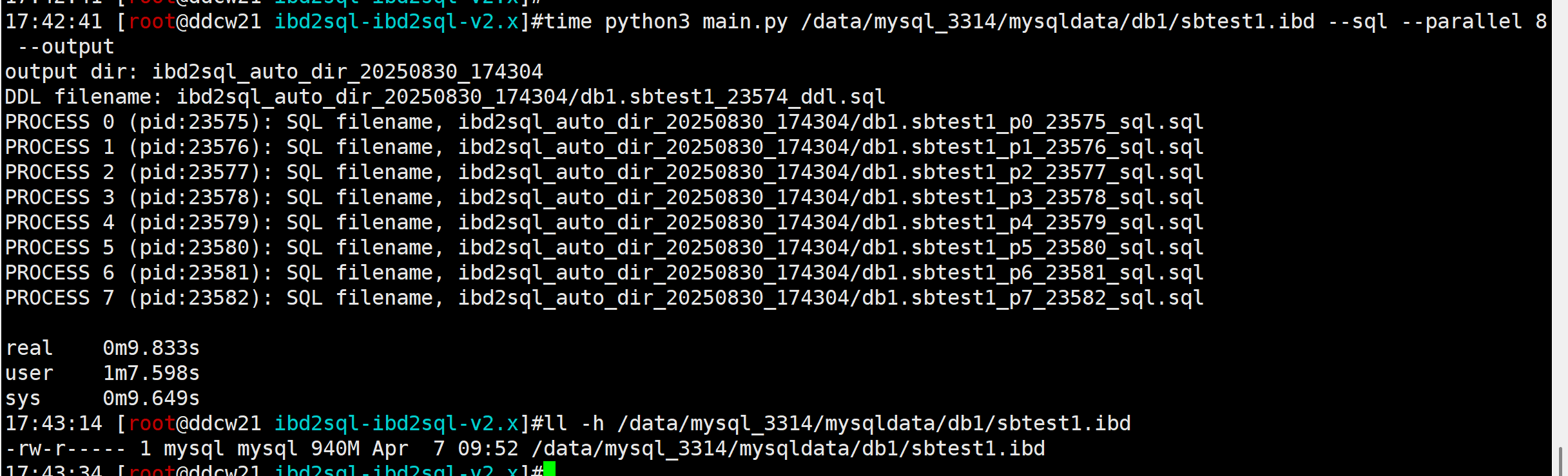 python3 main.py /data/mysql_3314/mysqldata/db1/sbtest2.ibd --sql --ddl解析数据文件,获取DDL和DML, 使用8个进程并发解析