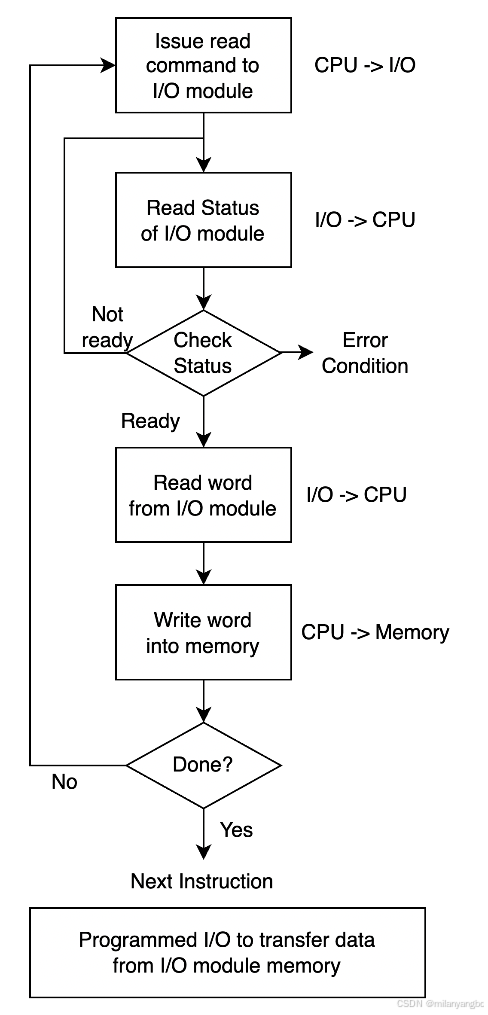 程序控制I/O是最简单的一种 I/O 模式。比如发起系统调用write,处理器会向I/O设备写入数据,写入后会一直轮询I/O设备的状态等待它完成。这个过程涉及到一个内核态和用户态的切换。这种方式虽然简单,但是它会占用全部的处理器资源,在某些复杂的系统中会造成计算资源的严重浪费。