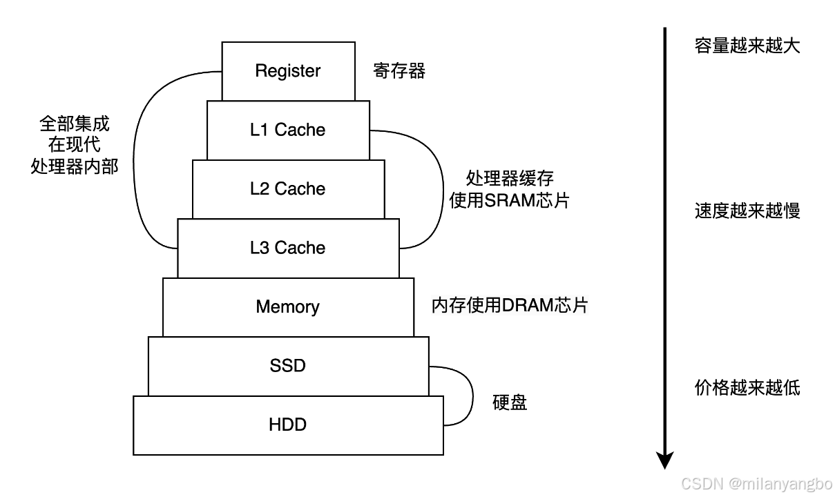 现代计算机的存储器设计地采用了一种分层次的结构。从塔尖的寄存器、高速缓存,到塔身的内存(主存),再到塔基的外部存储(硬盘/SSD),存储器的访问速度逐级递减,而容量逐级递增,单位存储成本也随之显著降低。