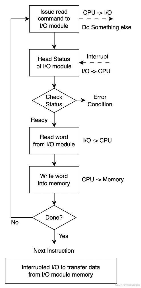 由于程序控制I/O让处理器处于不必要的繁忙之中,所以出现了中断驱动I/O,通过中断功能和特殊命令来通知接口,只要I/O设备有了需要的数据,便会发出中断请求信号。同时处理器可以继续执行其他程序。与程序控制I/O 相比,中断驱动 I/O 将一部分工作交给了 I/O 设备,所以能够提高资源的利用率。