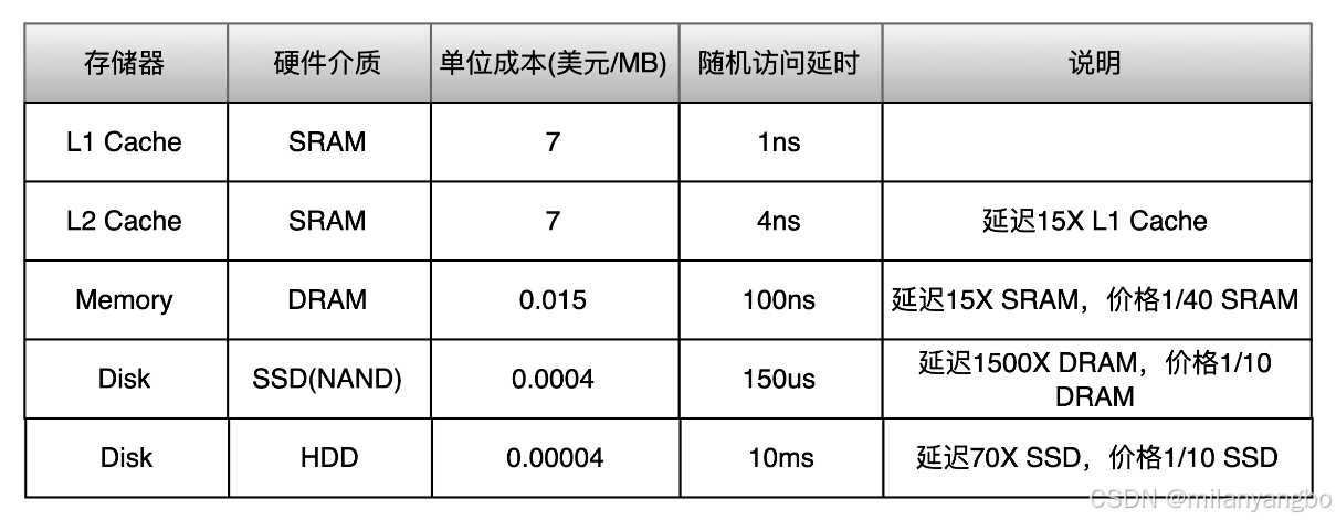 机械硬盘(Hard Disk Drive、HDD)和固态硬盘(Solid State Drive、SSD)是两种最常见的硬盘,作为计算机的外部存储,处理器想要访问它们存储的数据需要很长时间,如下表所示,在 SSD 中随机访问 4KB 数据需要的时间是访问内存的1500 倍,机械硬盘的寻道时间是访问内存的100000倍。