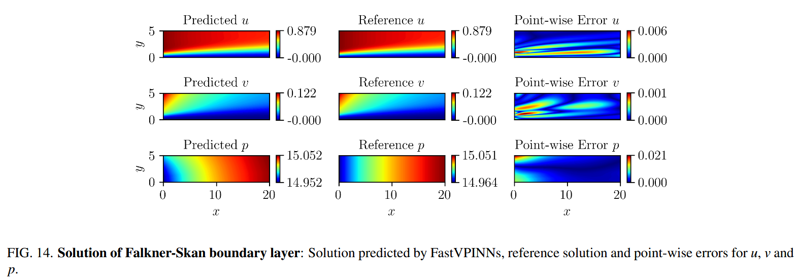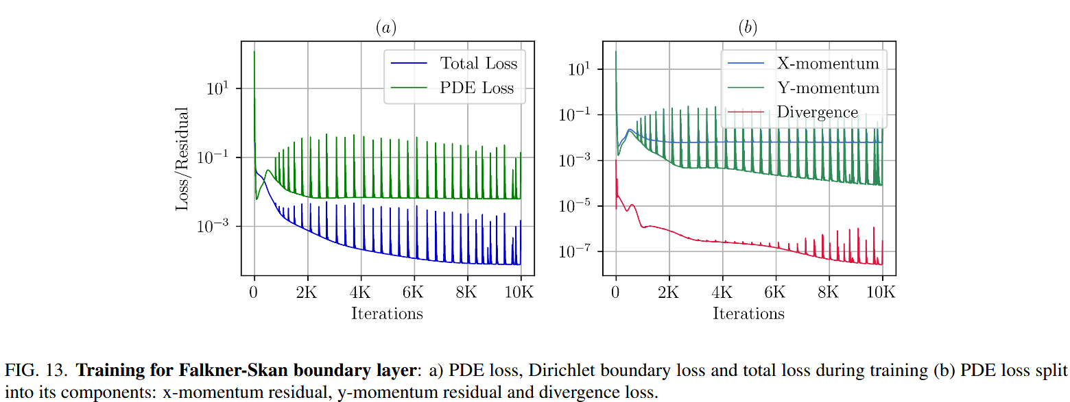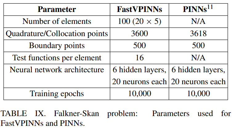 这个问题描述了层流区域稳定,不可压缩的边界层流的速度曲线。我们选择了这个问题来证明与传统的 Pinns 实现相比,FastVPINNs 的性能。在我们的研究中,我们采用了 Eivazi 等人 11 的问题参数,考虑到 $M = -0.08$ 的雷诺数为 $100$,导致楔形角 $β= -0.1988$。参考解决方案和 $PINNS$ 代码是从官方 GitHub Repository[33] 获得的。计算域跨越 X 差异 $[0,20]$ ,在 yDimension 中跨越[0,5]。表 IX 总结了我们的 FastVpinns 模拟中使用的关键参数和 PINNS 实现的比较。两种方法都使用 Adam Optimizer 训练 10,000 轮。我们报告了 10 次独立运行的平均结果。图 13 说明了训练的进展,显示了训练迭代中的总损失及其组成部分。等式中的加权系数 $α,β$ 和 $γ$。 方程 (8) 已设置为 1。表 X 详细介绍了 FastVPINNs 和 Pinns 之间的性能比较。值得注意的是,我们能够通过 FASTVPINN 实现重大加速。我们计算了一千次迭代的平均训练时间,发现 FastVPINNs 与 Pinns 实施相比,速度达到了 2.24 倍。具体而言,每 1000 次训练迭代需要 16.67 秒的 PINNS 代码,而 FastVPINNs 仅在 7.43 秒内完成了相同数量的迭代。