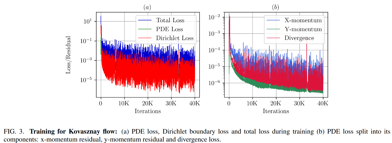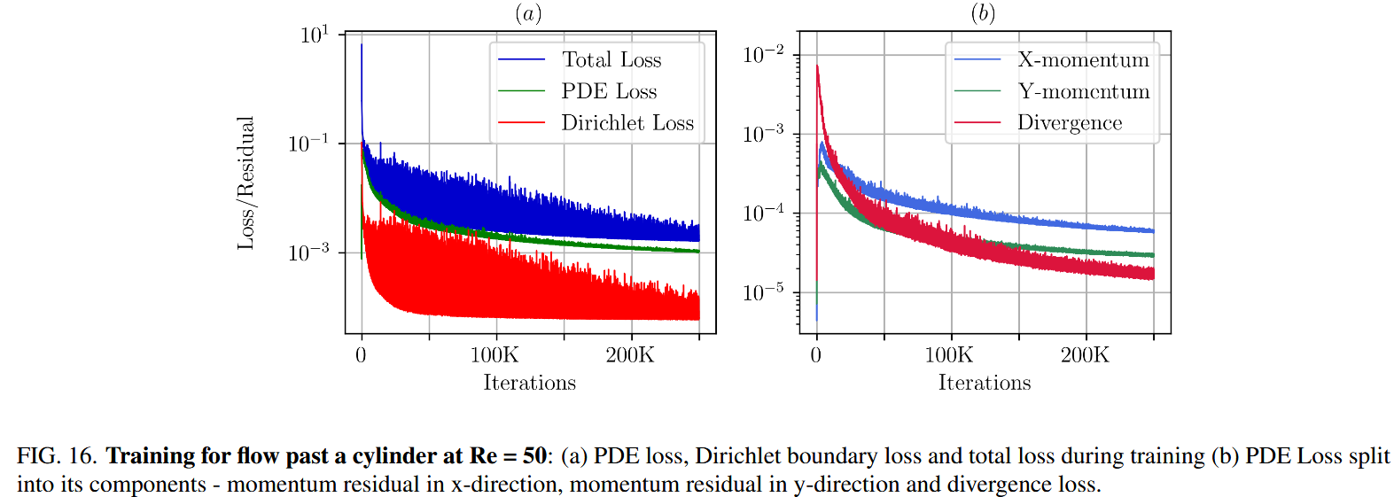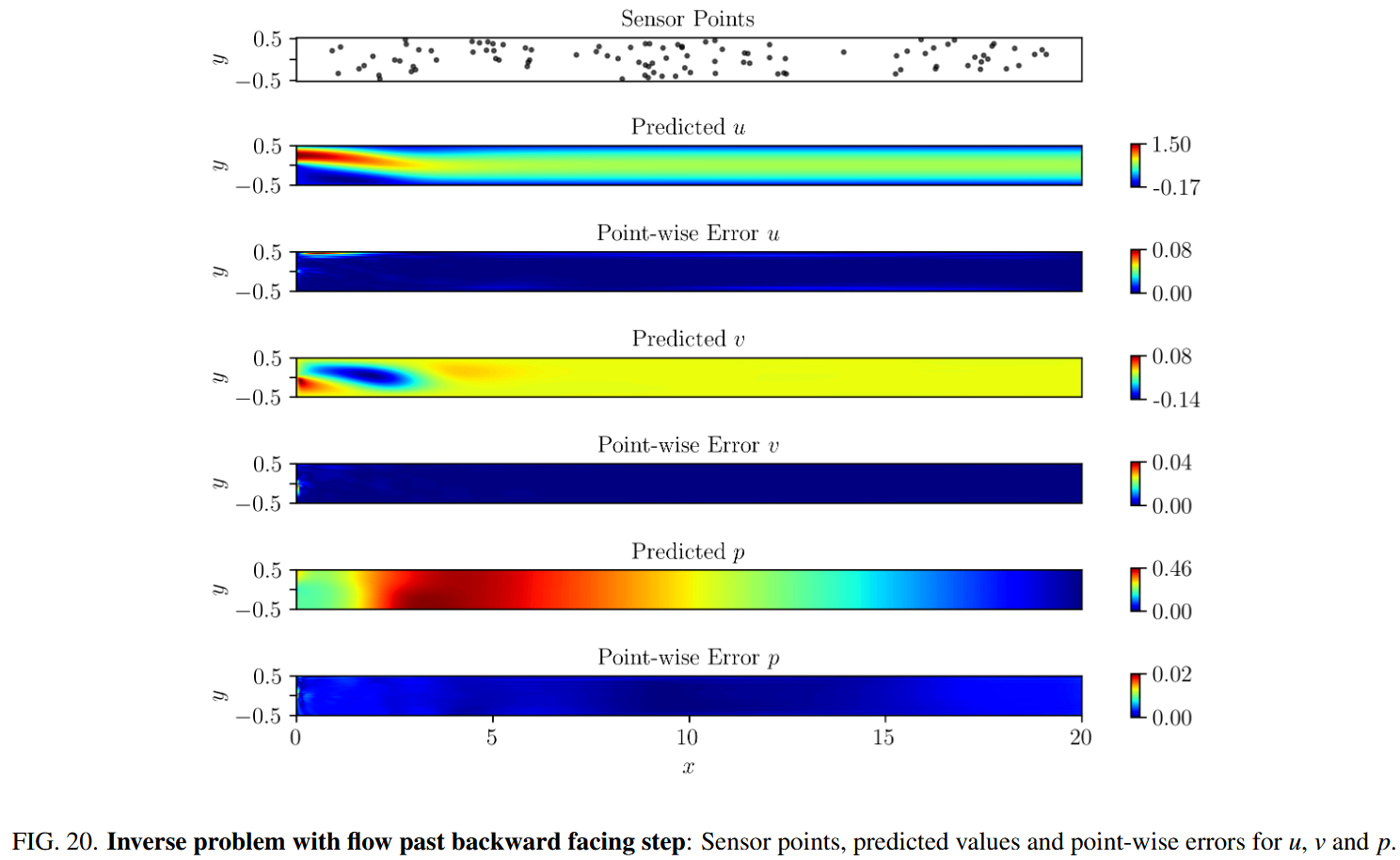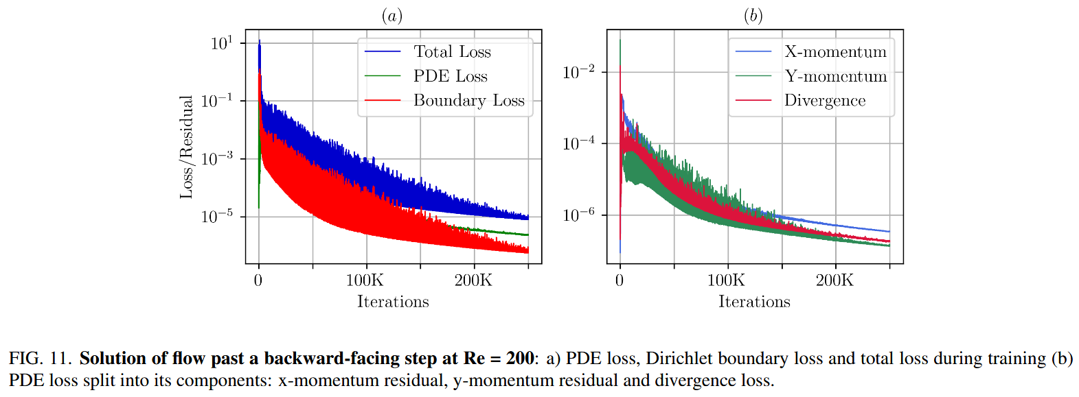 沿着左墙。该流量的实际雷诺数为 200,我们的模型旨在预测。我们使用 25 个测试函数和每个元素的 64 个正交点将域离散为 100 个元素(20×5),从而总共 6400 个正交点。此外,我们采样了 800 个边界点,并设置了 100 的边界 $τ$ 。为了预测雷诺数,我们利用域内的 100 个随机分布的传感器点来利用速度数据。我们的神经网络体系结构包括 8 个隐藏层,每个层有 50 个神经元,使用 $1.9×10^{-3}$ 的初始学习速率对 250,000 个时代进行了训练,并与指数型衰减调度程序(1500 衰减步骤,衰减率为 0.985)。图 18(a)和(b)说明了训练过程中各种损失成分的演变,从而洞悉了我们模型的收敛行为。传感器丢失表示神经网络预测与传感器点数据之间的差异,如图 18(a)所示。图 20 显示了最终预测的速度和压力场,证明了框架捕获流动模式的能力,同时估算了雷诺数。表 XII 列出了我们的预测的准确性,显示了雷诺数的初始猜测为 120 时,L2 的速度和压力组件的 RER 误差。训练模型花了 25 万次迭代。