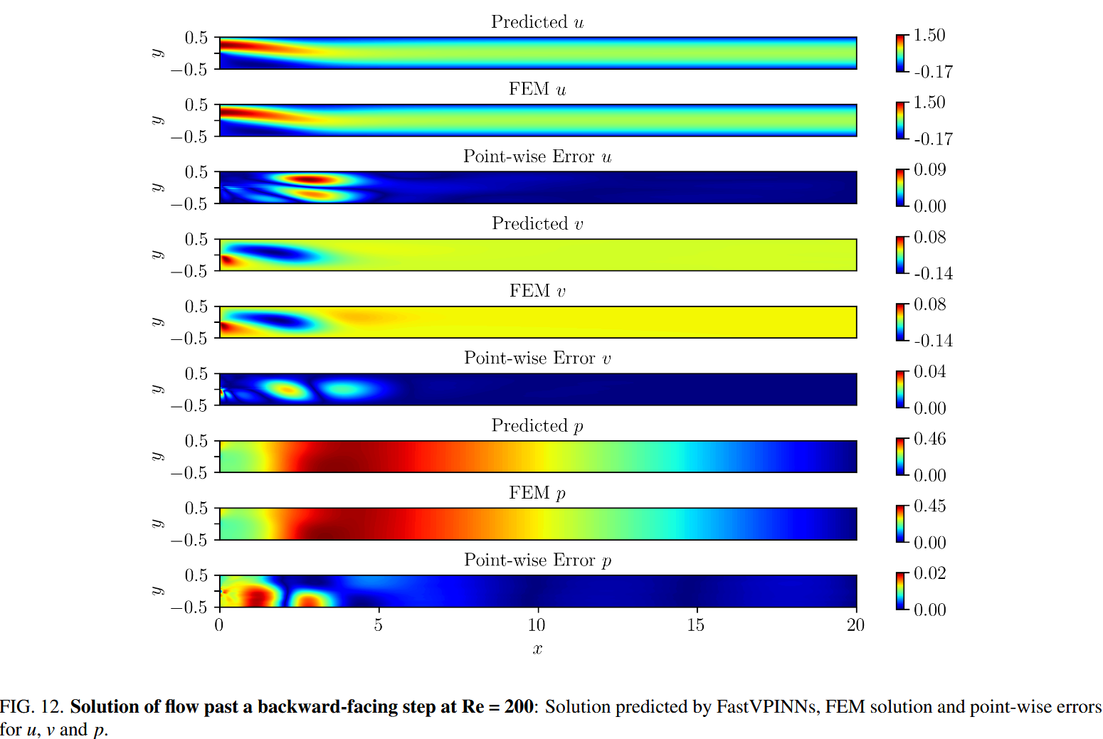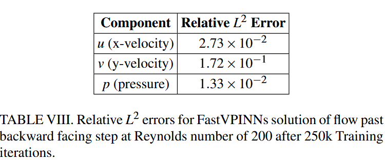 对于这个问题,我们采用了一个神经网络,该网络具有八个隐藏层,每个层都包含 50 个神经元。如图 11 所示,对该网络进行了 250,000 轮训练,初始学习率为 0.0015。该学习率是使用指数学习率调度程序衰减的,每 1000 步的衰减率为 0.98。等式中的加权系数。 (8)全部设置为 10。为了验证我们的方法,我们将我们的结果与从 FEM 获得的结果进行了比较。表 VIII 列出了速度成分 $u,v$ 和压力 $p$ 的 $L^2_{Rel}$ 误差。图 12 说明了通过神经网络,FEM 解决方案和速度和压力分量的点误差的预测解决方案之间的比较。我们的分析表明, FastVPINNs 的预测解决方案与 FEM 解决方案非常吻合,证明了我们在此复杂流动问题上的框架的有效性。