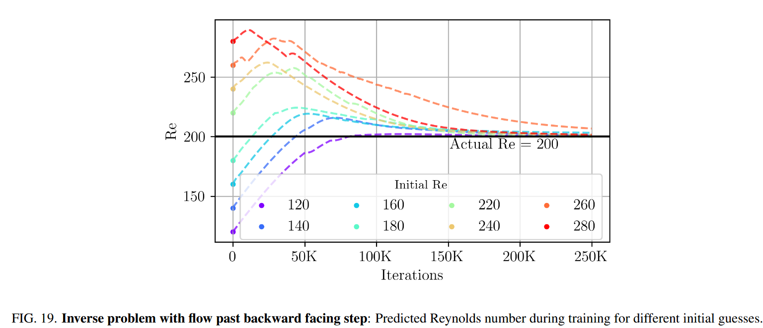 为了评估我们的方法的鲁棒性,我们初始化了雷诺数估计值,值范围从 120 到 280。图 19 说明了这些估计值与 200 的真实值的收敛性,突出了该框架准确确定雷诺数数量的能力,而不管最初的猜测如何。这些结果证明了 FASTVPINN 在解决流体动力学中解决反问题中的有效性,显示了对复杂几何形状中的参数估计和流动表征的应用的希望。
