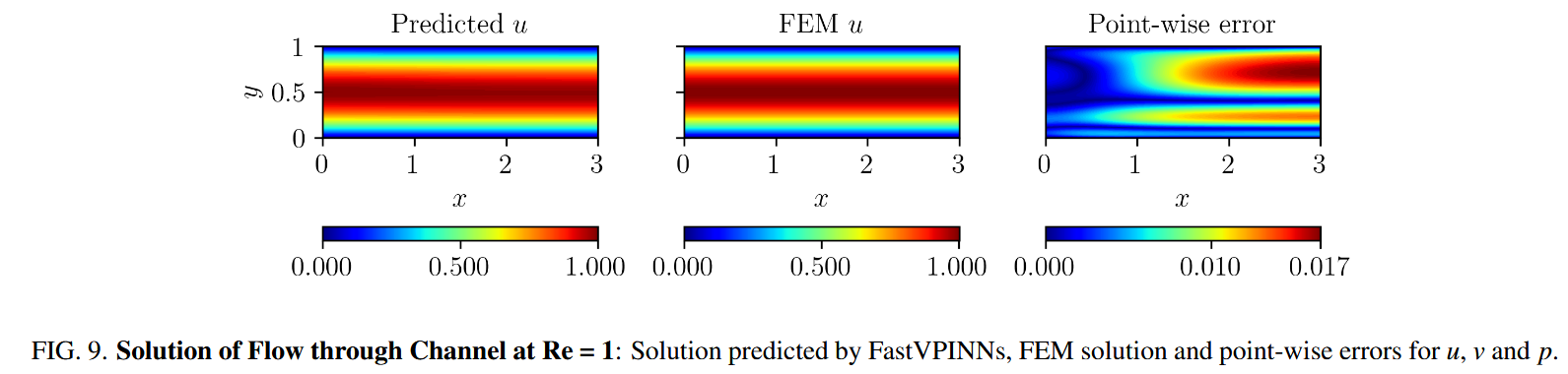 接下来,我们解决了通过矩形通道的流动,以验证我们的诺伊曼边界条件的实现。该案例研究涉及矩形结构域 $[0,3]×[0,1]$ 中的流体流量,使用一百个常规的四边形元件离散。入口速度轮廓定义为