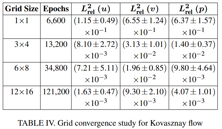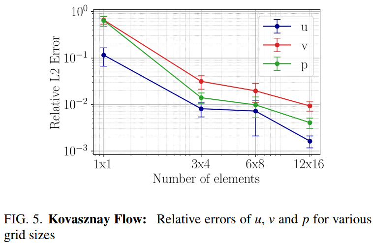 其中,$κ= 6000$ 代表时期的基本数量,而 $ξ= 6$ 是一个缩放因素,它解释了域内正交点的增加。表 IV 和图 5 显示了 u,v 和 p 的相对 $L^2$ 误差。我们观察到,通过足够的训练,随着域中元素数量的增加,测试误差会减少。