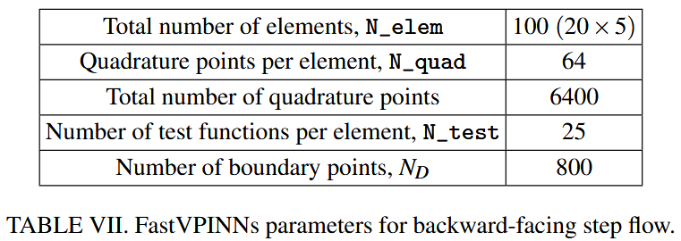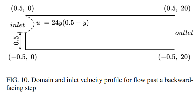 向后的步骤问题是流体动力学中充满挑战的情况,涉及突然扩展的通道。这种构型导致复杂的现象,例如流动分离,重新分析和再循环区域。我们以 200 的雷诺数为基础研究了这个问题,该问题为我们的 FastVPINNs 框架提供了重大测试,这是由于沿通道长度的较大域和变化的速度场。与 Gartling31 中类似的计算域在图 10 中说明了。该图既显示了向后的步骤的几何形状,又显示了我们模拟中使用的入口速度曲线。我们将域将域离散为 100 个元素(20×5),其中表 VII 中详细介绍了计算参数。