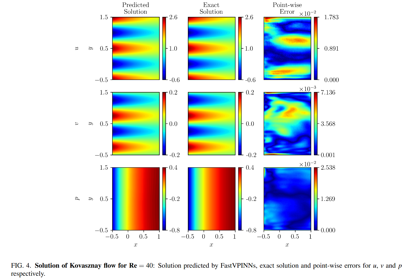 右侧项 $(f_x,f_y)$ 是通过在等式中替换(10)中的值来得出的。将粘度系数 $ν$ 设置为 1。计算域,$\Omega$ 由 $[-1,1]^2$ 给出,分别为 x-和 y-Dimensions 分别为 8 个元素。对于这个问题,我们使用一个神经网络,其中包含 3 个隐藏层,每个神经元包含 30 个神经元。该网络使用 0.001 的恒定学习率对 20,000 个时期进行了训练。为了计算损失,我们使用 25 个测试功能和每个元素的 100 个正交点,总共 6400 个正交点。边界损耗以 800 点计算,并在域的边界上采样。图 2 显示了精确的解决方案,即 FastVPINNs 预测的解决方案以及 $U$ 和 $V$ 组件的点误差。 FastVPINNs 能够为 $U$ 和 $V$ 分别达到 $1.9×10^{-3}$ 和 $6.1×10^{-3}$ 的 $L^2_{Rel}$ 误差。此外,平均训练时间为每个时期 2.4ms,突出了我们方法的计算效率。
