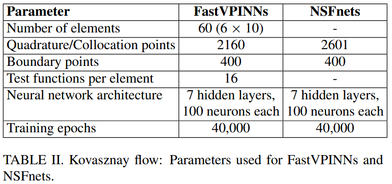 我们在矩形域 $[-0.5,1]×[-0.5,1.5]$ 上解决了 $Re = 40$ 的 kovasznay flow。该结构域在 x 维度中被 6 个 cell 离散,在 Y 维度中将 10 个 cell 离散,因此 $N_elem = 60$。在 NSFnets 中,使用具有 7 个隐藏层的神经网络获得了最佳溶液,每个层均包含 100 个神经元,总计为 2601 和 400 个边界点。为了与 NSFnets 进行公平的比较,我们将使用相同的网络体系结构以及表 II 中的参数。等式中的加权系数 $α$,$β$ 和 $γ$。在公式(8)中全部设置为 10。