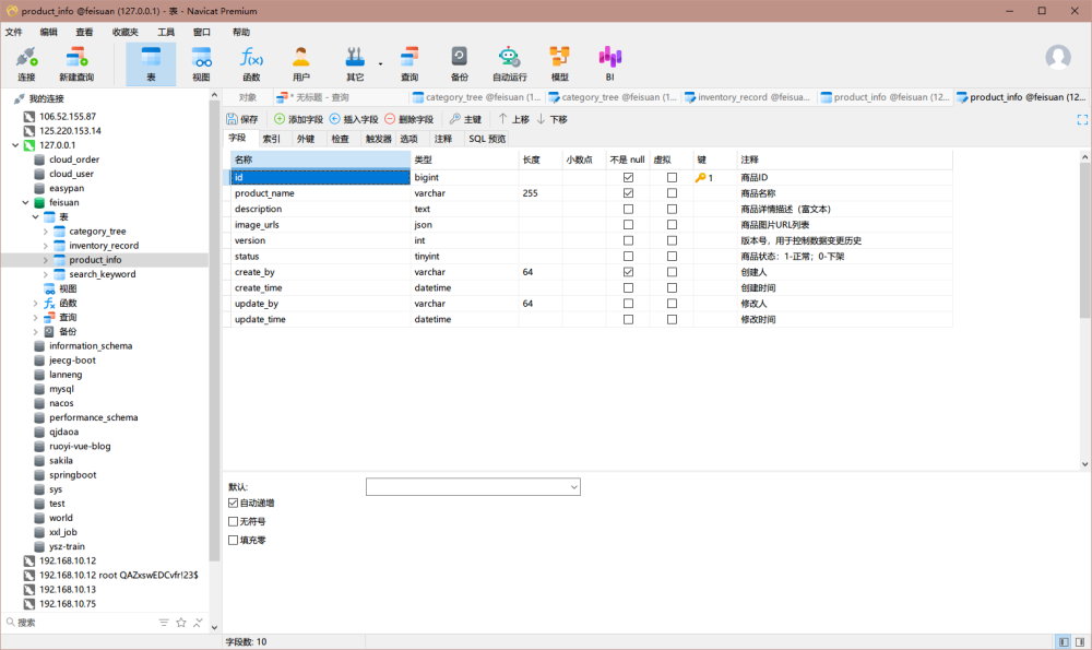 CREATE TABLE product_info ( id BIGINT PRIMARY KEY AUTO_INCREMENT COMMENT '商品ID', product_name VARCHAR(255) NOT NULL COMMENT '商品名称', description TEXT COMMENT '商品详情描述(富文本)', image_urls JSON COMMENT '商品图片URL列表', version INT DEFAULT 0 COMMENT '版本号,用于控制数据变更历史', status TINYINT DEFAULT 1 COMMENT '商品状态:1-正常;0-下架', create_by VARCHAR(64) NOT NULL COMMENT '创建人', create_time DATETIME DEFAULT CURRENT_TIMESTAMP COMMENT '创建时间', update_by VARCHAR(64) COMMENT '修改人', update_time DATETIME ON UPDATE CURRENT_TIMESTAMP COMMENT '修改时间' ) COMMENT='商品信息表';