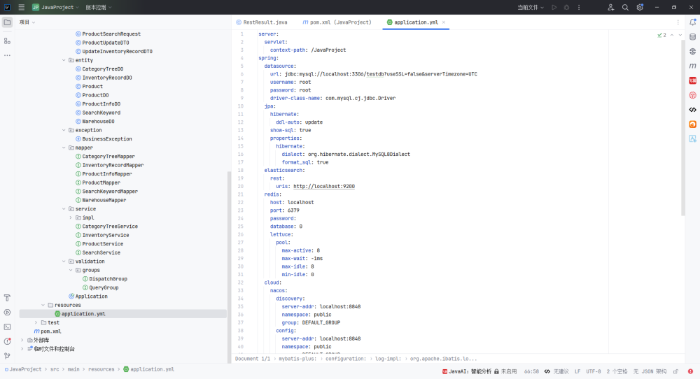 这个配置文件是一个完整的Spring Boot应用配置,涵盖了Web服务、数据库、缓存、搜索、微服务组件和日志系统等多个方面,适用于企业级Java后端项目,特别是基于Spring Cloud Alibaba的微服务架构。
