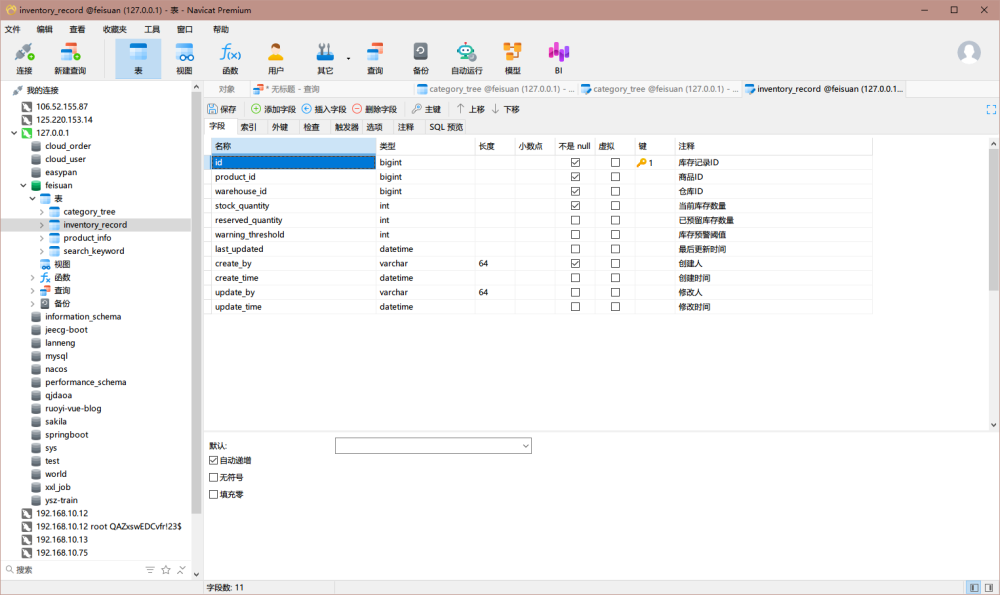 CREATE TABLE inventory_record ( id BIGINT PRIMARY KEY AUTO_INCREMENT COMMENT '库存记录ID', product_id BIGINT NOT NULL COMMENT '商品ID', warehouse_id BIGINT NOT NULL COMMENT '仓库ID', stock_quantity INT NOT NULL COMMENT '当前库存数量', reserved_quantity INT DEFAULT 0 COMMENT '已预留库存数量', warning_threshold INT DEFAULT 0 COMMENT '库存预警阈值', last_updated DATETIME DEFAULT CURRENT_TIMESTAMP ON UPDATE CURRENT_TIMESTAMP COMMENT '最后更新时间', create_by VARCHAR(64) NOT NULL COMMENT '创建人', create_time DATETIME DEFAULT CURRENT_TIMESTAMP COMMENT '创建时间', update_by VARCHAR(64) COMMENT '修改人', update_time DATETIME ON UPDATE CURRENT_TIMESTAMP COMMENT '修改时间' ) COMMENT='动态库存记录表';