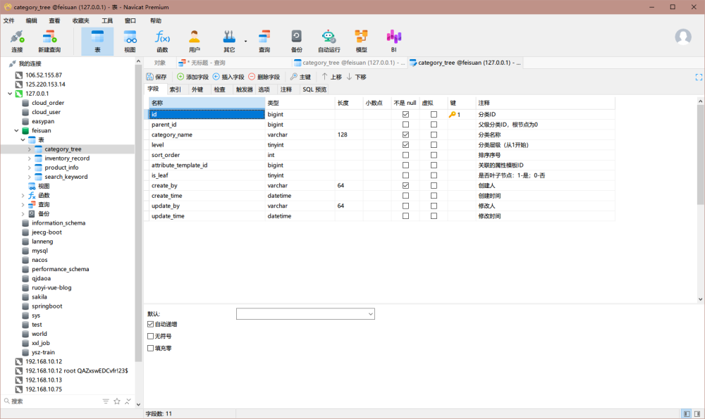 CREATE TABLE category_tree ( id BIGINT PRIMARY KEY AUTO_INCREMENT COMMENT '分类ID', parent_id BIGINT DEFAULT 0 COMMENT '父级分类ID,根节点为0', category_name VARCHAR(128) NOT NULL COMMENT '分类名称', level TINYINT NOT NULL COMMENT '分类层级(从1开始)', sort_order INT DEFAULT 0 COMMENT '排序序号', attribute_template_id BIGINT COMMENT '关联的属性模板ID', is_leaf TINYINT DEFAULT 0 COMMENT '是否叶子节点:1-是;0-否', create_by VARCHAR(64) NOT NULL COMMENT '创建人', create_time DATETIME DEFAULT CURRENT_TIMESTAMP COMMENT '创建时间', update_by VARCHAR(64) COMMENT '修改人', update_time DATETIME ON UPDATE CURRENT_TIMESTAMP COMMENT '修改时间' ) COMMENT='分类树结构表';