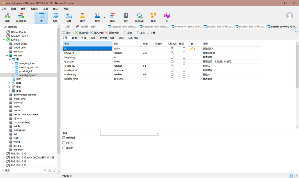 CREATE TABLE search_keyword ( id BIGINT PRIMARY KEY AUTO_INCREMENT COMMENT '关键词ID', keyword VARCHAR(255) NOT NULL COMMENT '搜索关键词', frequency INT DEFAULT 0 COMMENT '搜索频率', is_active TINYINT DEFAULT 1 COMMENT '是否启用:1-启用;0-禁用', create_by VARCHAR(64) NOT NULL COMMENT '创建人', create_time DATETIME DEFAULT CURRENT_TIMESTAMP COMMENT '创建时间', update_by VARCHAR(64) COMMENT '修改人', update_time DATETIME ON UPDATE CURRENT_TIMESTAMP COMMENT '修改时间' ) COMMENT='搜索关键词统计表';