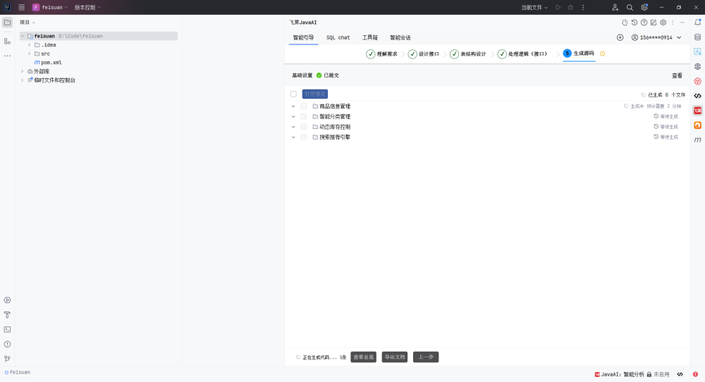 经过了前四个阶段,飞算AI已经分析完毕,现在可以进行源码的生成了,点击开始,等待一段时间