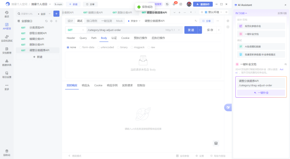 | 拖拽调整分类 | 必填: - categoryId(分类ID)- targetParentId(目标父级ID)- sortOrder(排序序号) | 1. 检查分类是否存在 → 中断 2. 更新父级和排序信息 → 成功 | {"code":"000001","msg":"分类不存在"}{"code":"000000","msg":"调用成功"} |