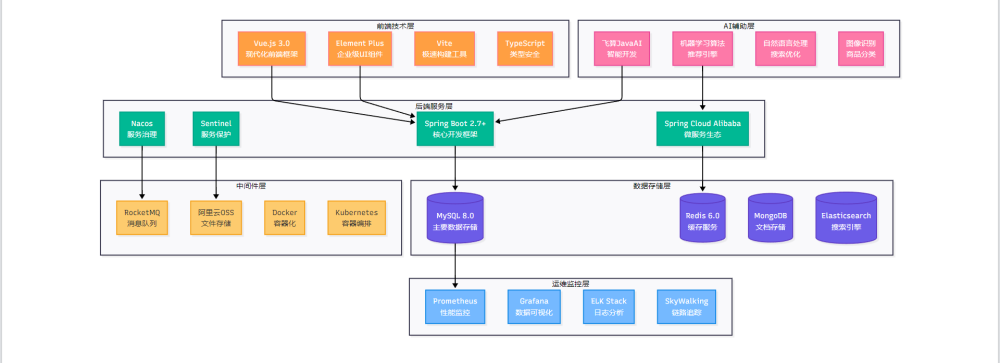 微服务与运维: 全面拥抱云原生技术理念,采用Docker容器化部署策略,Kubernetes作为容器编排平台,Nacos提供服务注册发现与配置管理,Sentinel实现服务熔断保护。同时集成Prometheus+Grafana监控体系和ELK日志分析平台,构建完善的DevOps运维生态,确保系统7x24小时稳定运行。