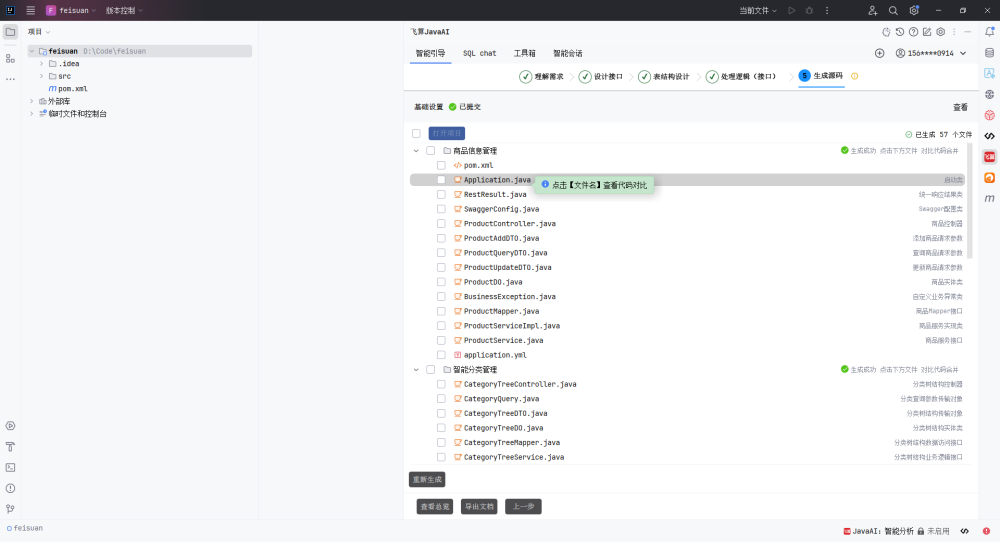 我们可以看到飞算AI一共生成了57个文件,包括了entity(DO、DTO、Bean、Result)、controller、service、mapper等等,相当的全面!