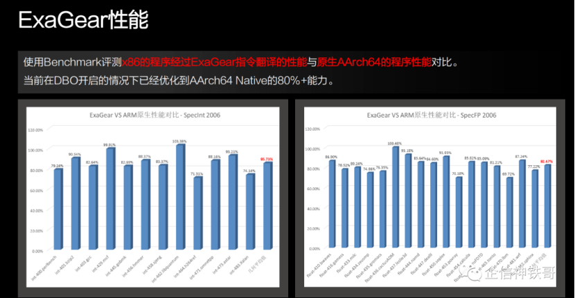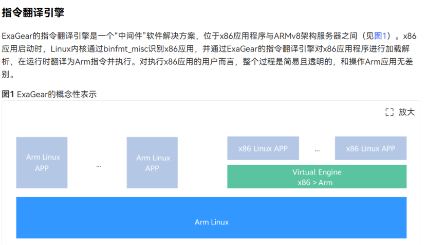 华为也有一款动态二进制翻译工具ExaGear,可将X86或者Arm32指令翻译成Arm64指令。在官网和公开网站找到了一些说明图,大家可以参考下: