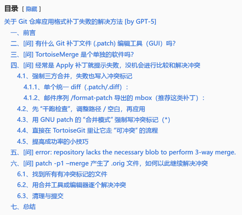 其实我想要的功能很简单,要么能正常解决冲突;要么能选择补丁中的某几项修改进行应用;要么自动把没冲突的文件应用了,其它的忽略;可现实是,以上这些基本都不行,也是奇了怪了;小乌龟也不行,之前问了其它 AI,也没什么好方法。