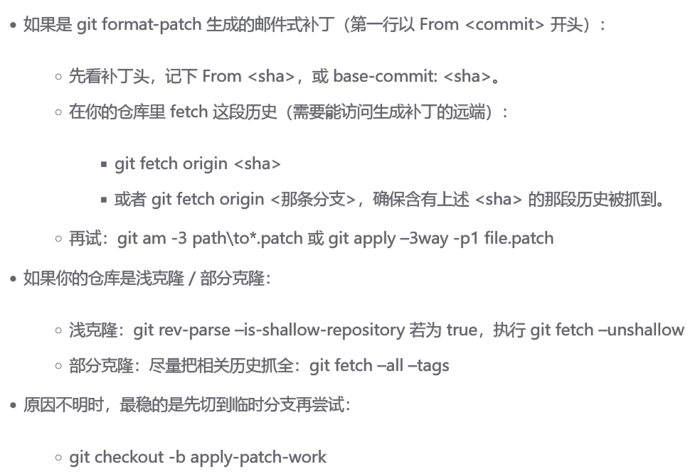 (1)把补丁的 “基底提交 / 历史” 取到本地,再重试 3-way