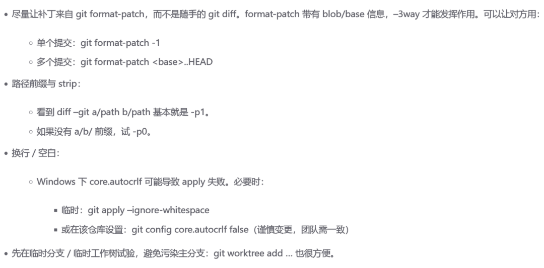 - 空白 / 换行导致匹配失败时:加 –ignore-whitespace 或先 git apply –check 试探参数组合。