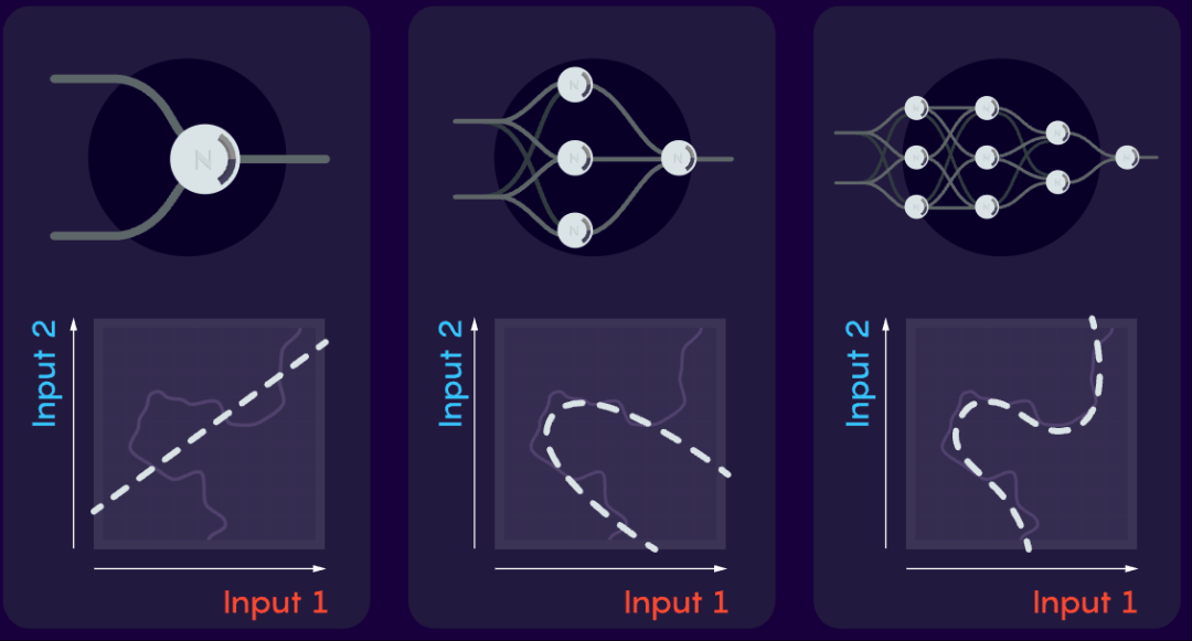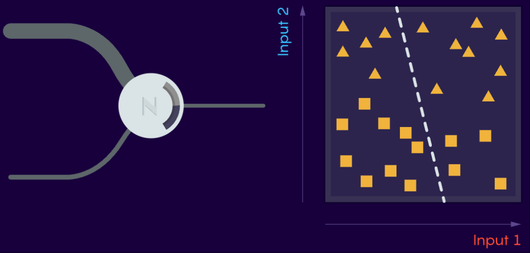 单个神经元效果很好,但这仅仅是因为三角领地和方形之间的真实边界接近直线,对于更复杂的任务,我们需要使用由许多相互连接的神经元组成的集合——神经网络。