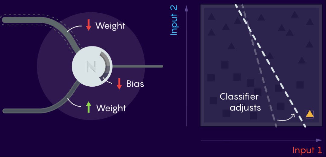 为了创建一个分类器,告诉我们一个新点应该位于正方形状态还是三角形区域,我们需要优化这条边界线,使其准确地表示两个区域之间的边界。 在这里,如果输出接近于 0,我们就说一个点位于正方形状态;如果输出接近于 1,我们就说一个点位于三角形区域。 为了优化这条边界线,我们需要通过一个叫做“训练”的过程来调整神经元的参数,第一步是将参数设置为随机值,这意味着神经元的初始边界线看起来与实际边界完全不同。