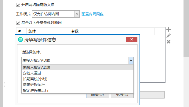 终端防火墙支持多种断网触发条件,如未接入指定AD域、安检未通过、长期离线(小时)、指定进程运行、指定进程未运行等。断网时可设置允许访问的地址,保障必要通信。同时,能禁用高危端口,降低安全风险,确保网络安全稳定运行。