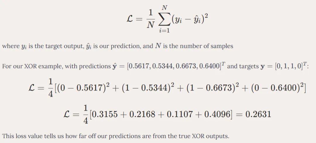 接下来才是真正令人兴奋的地方。假设我们刚刚对异或问题进行了推理,得到的预测结果类似于 [0.8, 0.3, 0.1, 0.9],而我们实际想要的是 [1, 0, 0, 1]。我们的模型表现很差,需要改进它。这时训练就派上用场了。我们将使用一个叫做损失函数的东西来准确地告诉模型它的表现有多差。为了简单起见,我们选择了均方误差 (MSE)—— 可以把它想象成测量预测结果与实际期望结果之间的「距离」,就像测量篮球投篮偏离目标的距离一样。我们用 L 表示损失。