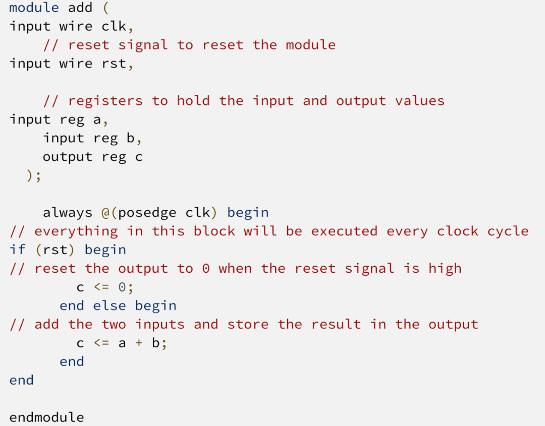 我们用来描述硬件的语言叫做 Verilog。它是一种硬件描述语言,允许我们描述给定硬件模块的行为(类似于软件中的函数),但它不是以程序的形式执行,而是合成布尔逻辑门(AND 与、OR 或、NOT 非等),这些逻辑门可以组合起来,构建我们想要的任何芯片的数字逻辑。以下是 Verilog 中加法运算的一个简单示例: