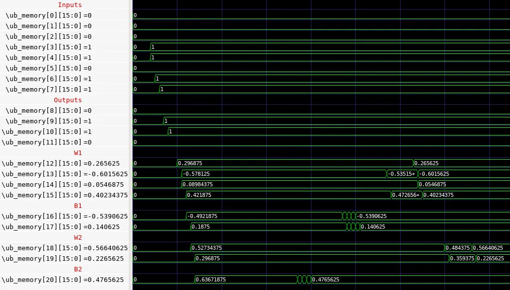 GTKWave 中的最终波形模拟显示一个时期后内存中的权重和偏差更新。